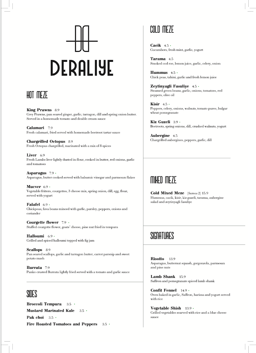 Welcome to Deraliye, a vibrant Turkish restaurant located at 98 Cockfosters Rd, London. After its recent refurbishment, Deraliye presents a fresh and exciting menu that celebrates the essence of Turkish cuisine. Guests can indulge in premium steaks like Sirloin and Gold Ribeye, or explore signature dishes such as the rich Risotto and tender Lamb Shank.